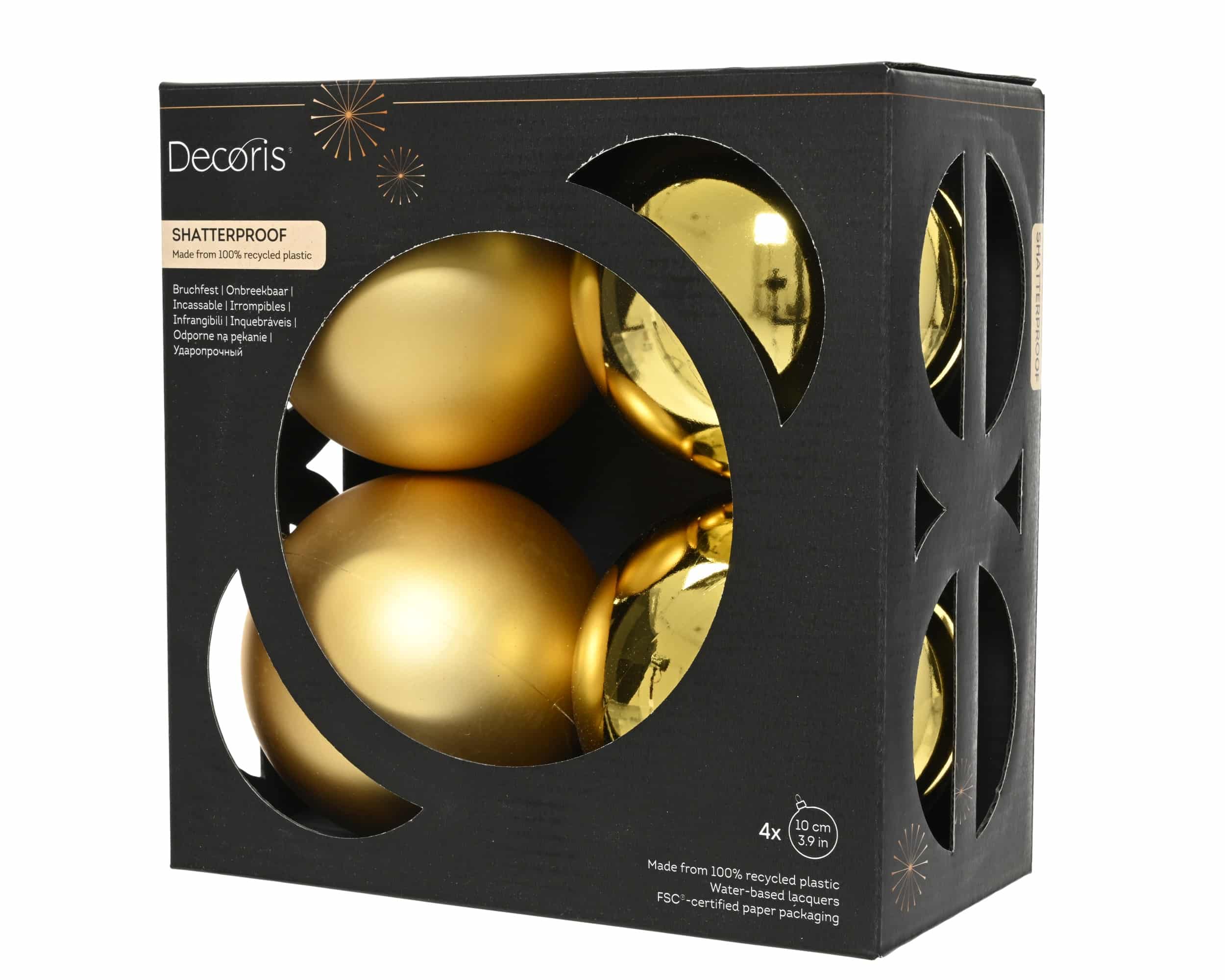 Bring festive warmth to your home with the 10cm Gold Shatterproof Christmas Bauble (Pack of Four). These beautiful ornaments add a rich golden glow to any Christmas decoration. Each set includes two shiny and two matt baubles, giving your tree a balanced, elegant finish. The reflective gold surface pairs perfectly with traditional red and green tones. Made from recycled plastic, these baubles are lightweight, durable, and safe for families and pets. The eco-friendly cardboard packaging helps reduce waste and supports sustainable decorating.