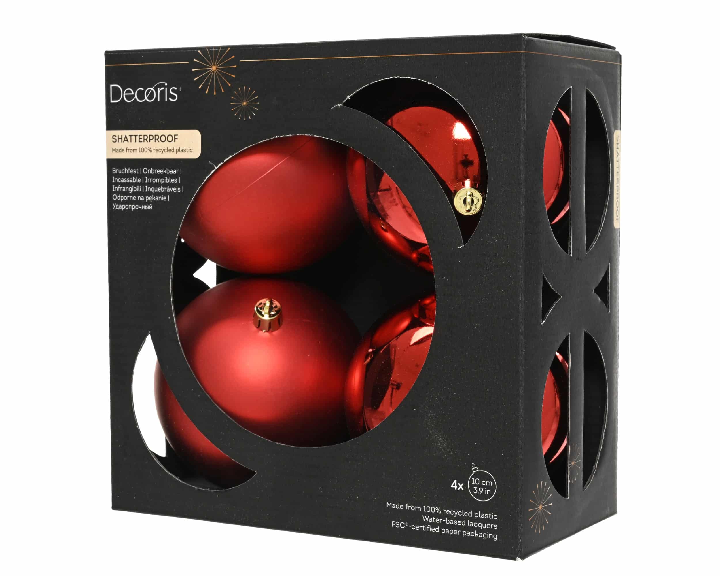Bring festive warmth to your home with the 10cm Red Shatterproof Christmas Bauble (Pack of Four). These beautiful ornaments add a rich festive glow to any Christmas decoration. Each set includes two shiny and two matt baubles, giving your tree a balanced, elegant finish. The reflective red surface pairs perfectly with traditional red and green tones. Made from recycled plastic, these baubles are lightweight, durable, and safe for families and pets. The eco-friendly cardboard packaging helps reduce waste and supports sustainable decorating.