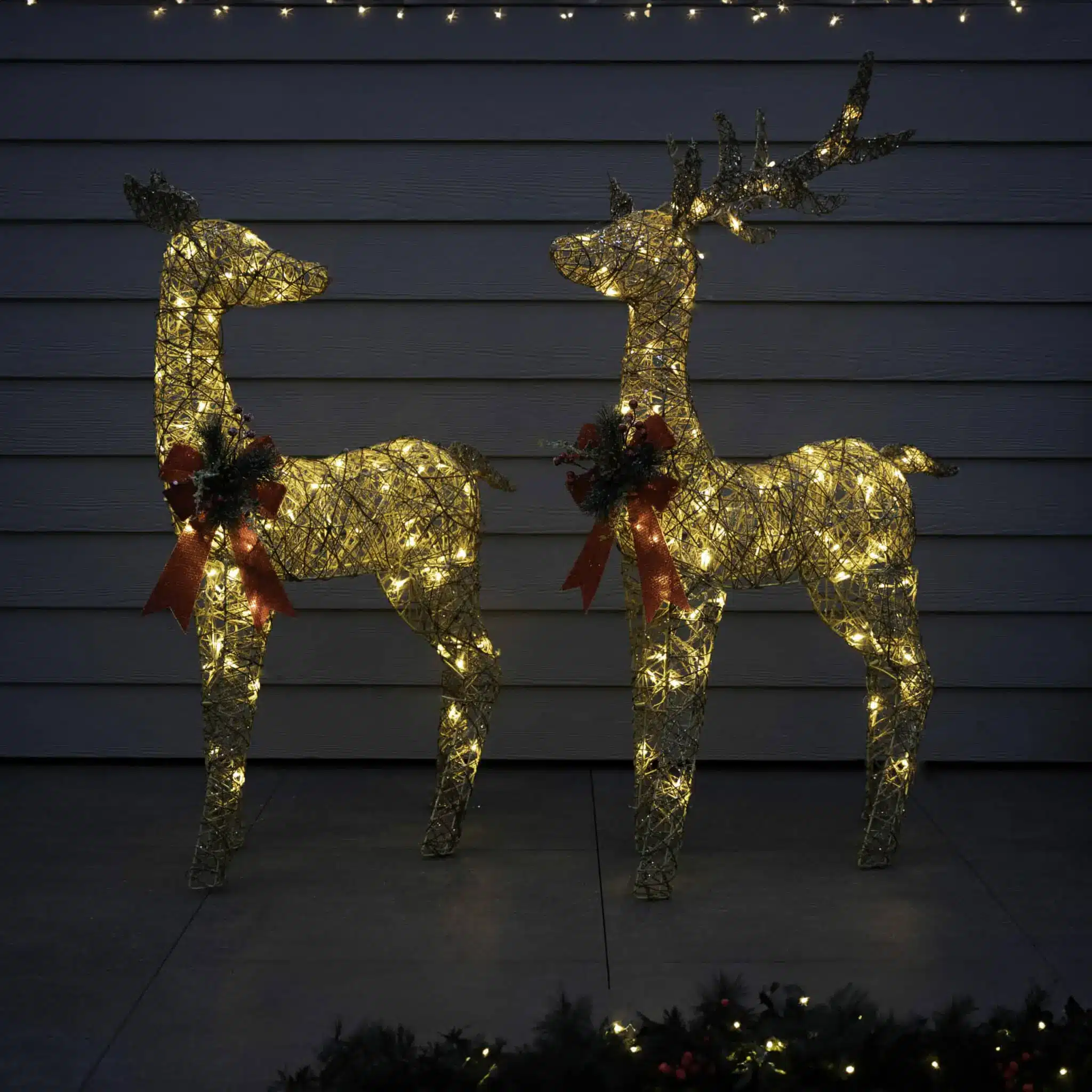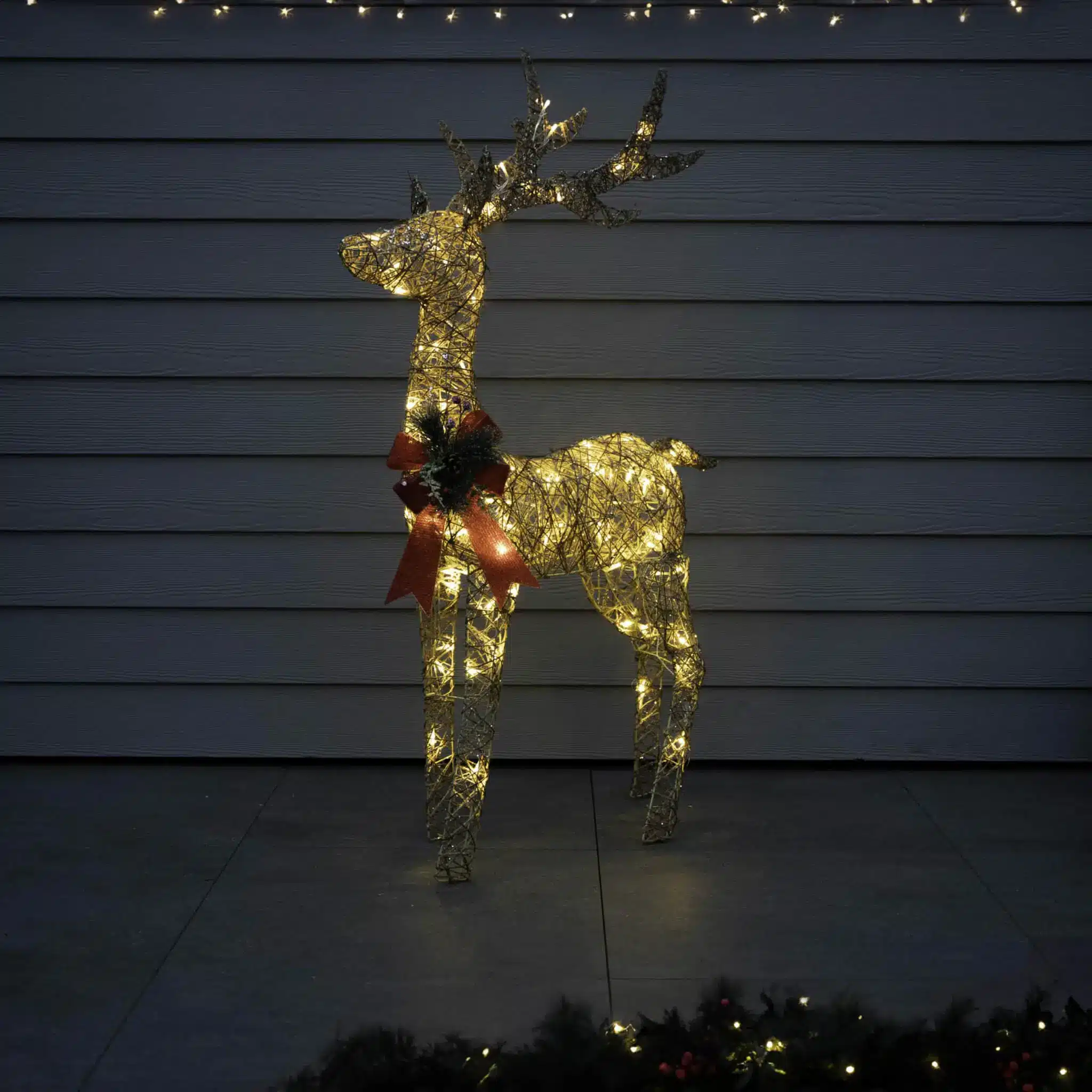 Covered in a shimmering gold glitter finish, this reindeer catches the light beautifully, creating a magical glow. The 80 warm white LED lights are thoughtfully placed to focus on its intricate design, making it a stunning focal point for both day and night. Whether it’s your living room, entryway, garden, or patio, this reindeer delivers a delightful touch of holiday cheer.