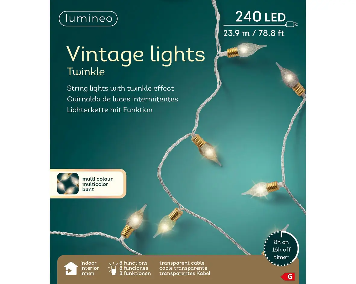 Introducing our 240 LED Vintage Colour Twinkle Lights, a vibrant fusion of transparent, warm white, light green, classic warm, and pink hues, adding a captivating and playful charm to your space with a touch of timeless nostalgia.