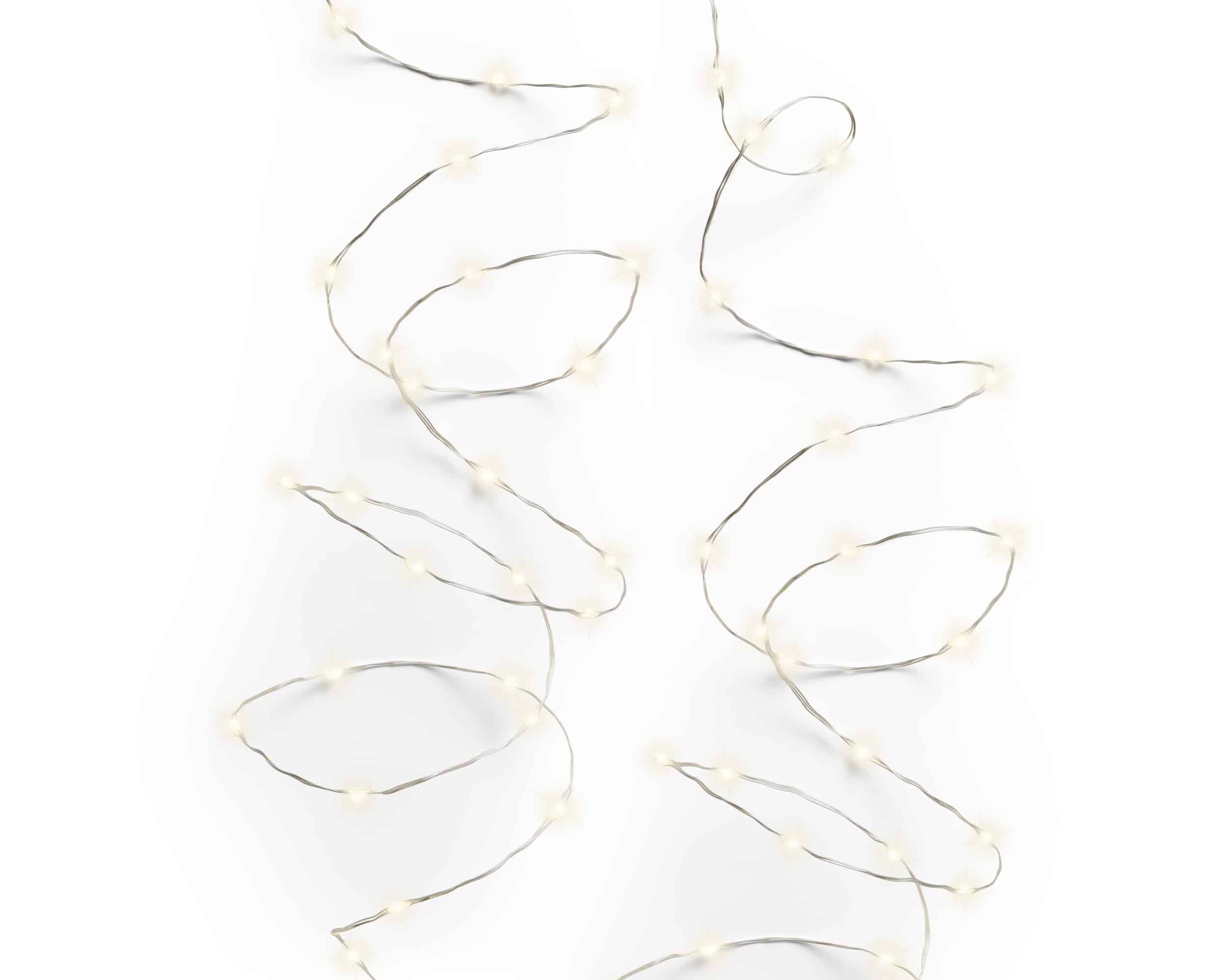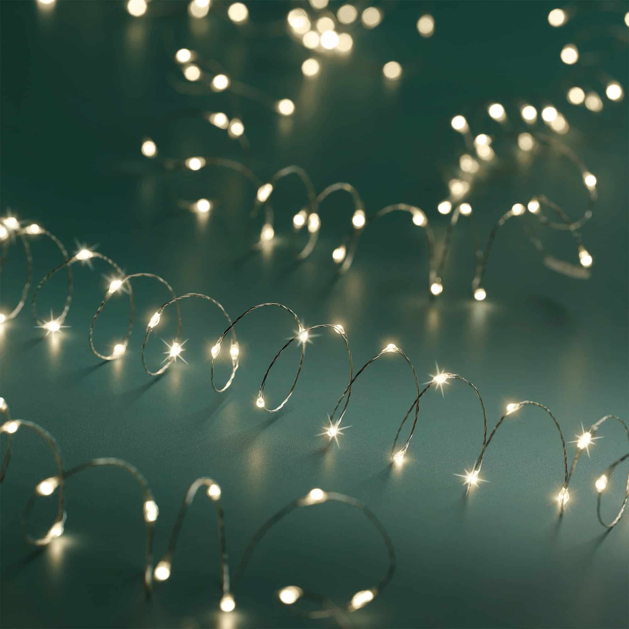 Bring home the Micro LED Twinkle String lights with Warn white glow and on silver cable. Best lights when it comes to decorating an unlit Christmas wreaths, garlands and decorations. Add lights to your indoor or outdoor decoration with this robust, high quality string lights on silver thin and light weight wire.