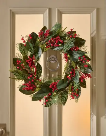 Designed to impress, this classic wreath blends lush foliage with rich red berries for a beautifully natural look. It’s pre-lit with 50 warm white LED lights, giving off a soft, cosy glow that welcomes guests and adds seasonal warmth to your space – whether it’s hanging proudly on your front door, brightening up a hallway, or styled over your mantelpiece.