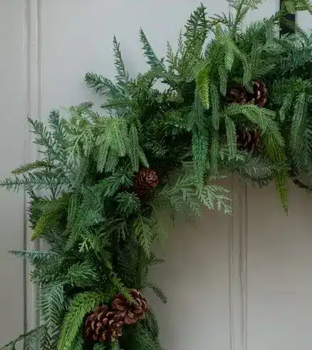 Moreover, its UV-resistant finish protects the wreath against fading, ensuring it retains its vibrant green colour even in outdoor settings. As a result, you can style it with confidence on garden walls, gates, or pergolas, as well as indoors in living rooms, hallways, or reception areas. In addition, its versatile style makes it perfect not only for Christmas but also as a year-round decoration for homes, weddings, or events.