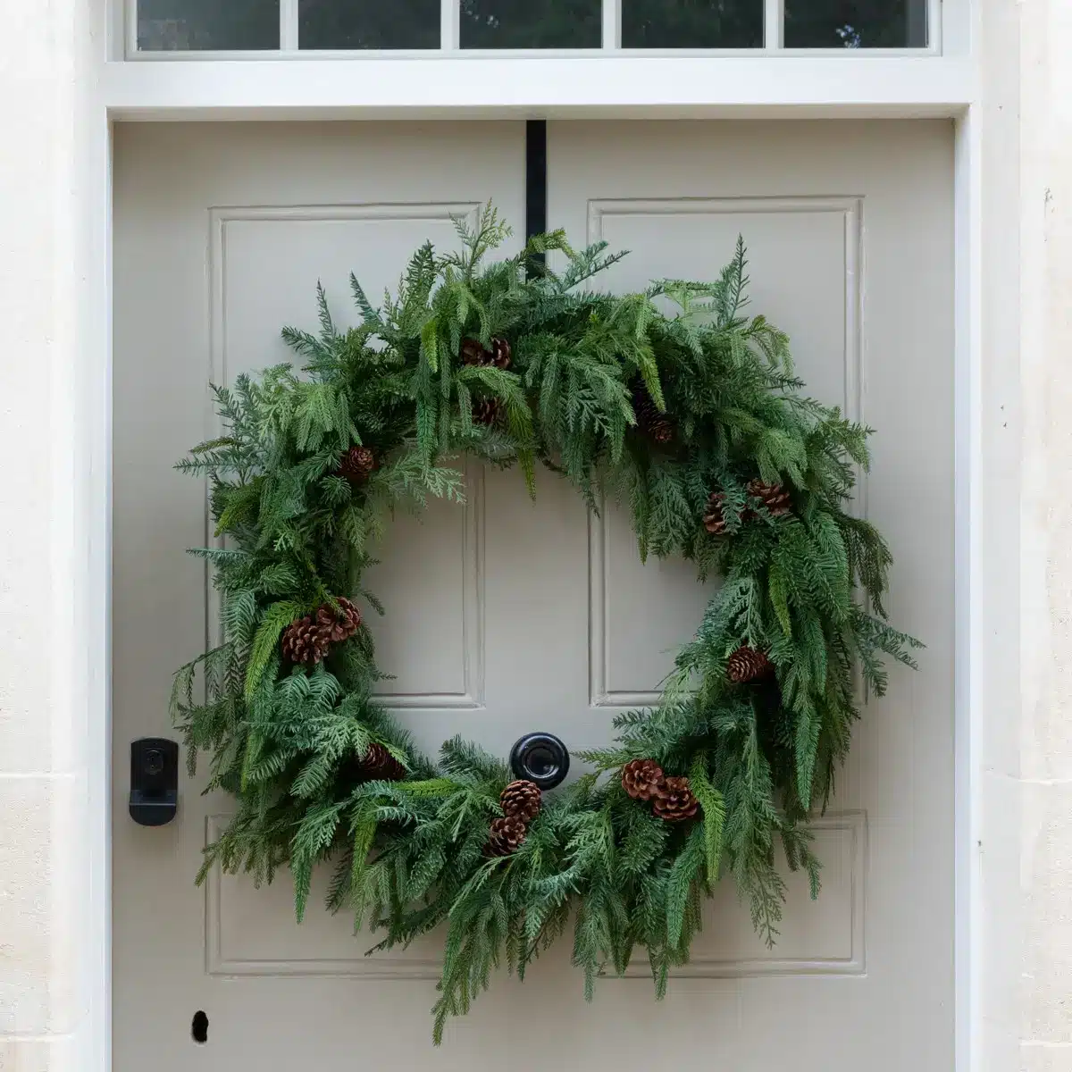 We design this wreath with dense, realistic cedar foliage, so it provides the fresh look of greenery without the need for maintenance. Its impressive 91cm size makes it a striking centrepiece, ideal for large front doors, spacious walls, or as a statement feature above a mantelpiece.