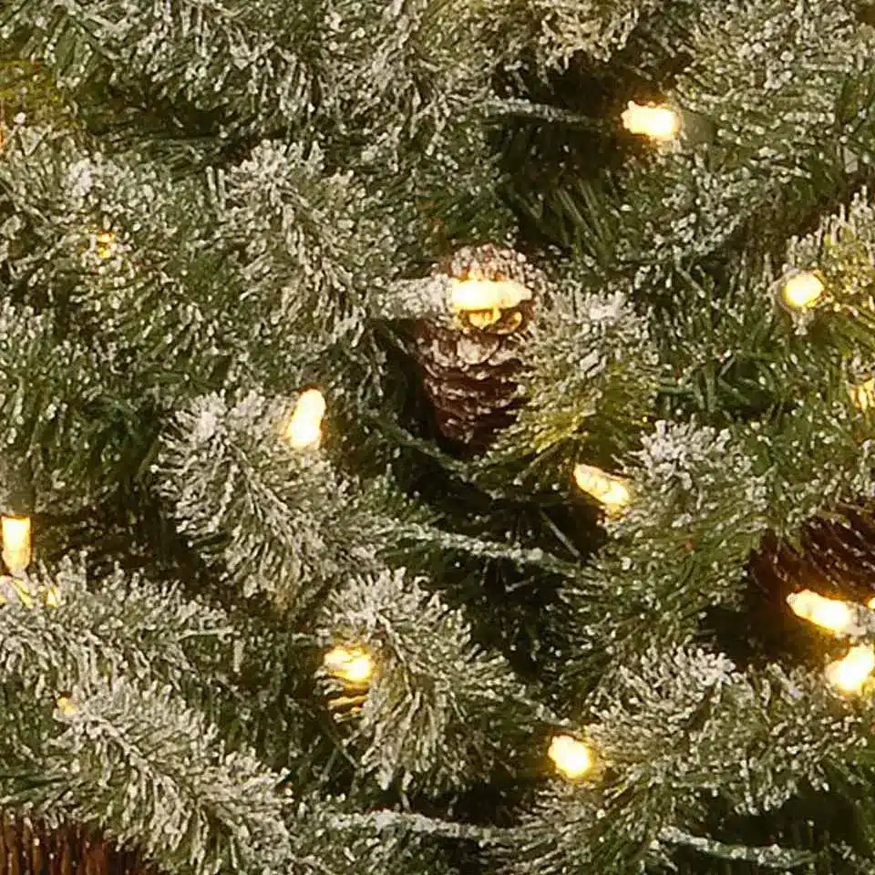 Pre-lit with 50 warm white LED lights, this tree creates a magical winter wonderland glow. The soft light illuminates the flocked branches, which boast a realistic snowy effect. This combination creates a whimsical and charming atmosphere that is sure to bring joy to children and adults alike.