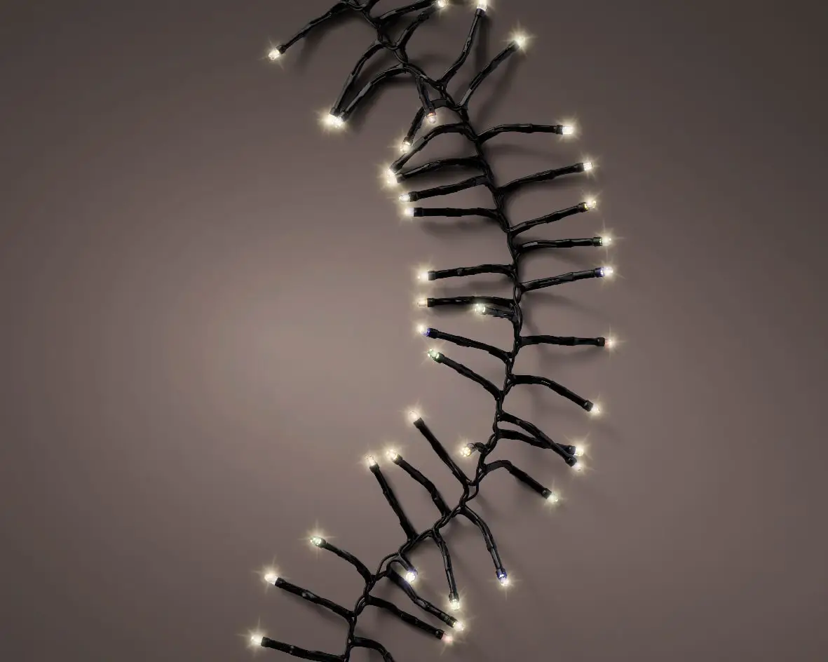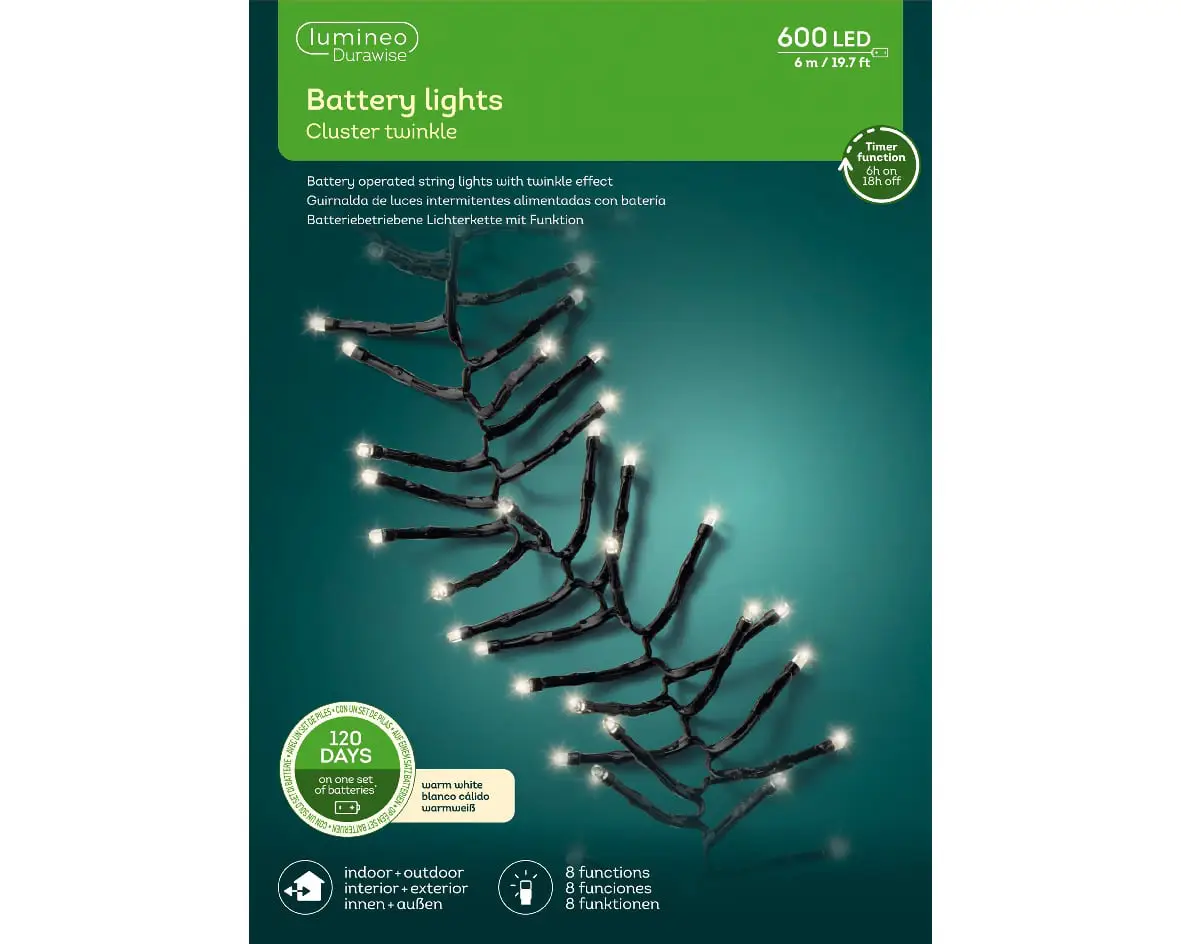 The cluster Cluster Durawise Warm White Battery include 600 individual LED lights per box, providing you with a fantastic intensity of light for any application. As with all of our LED lights, the Cluster Christmas Lights can be used indoors or outdoors, and there is an 6.5-meter cable length from the power source to the last light. There is an 8-function control box offering various twinkling formats (including Steady). This set of lights also features an 8-hour memory timer that allows you to set when you want your lights to turn on every evening and automatically turn them off eight hours later.
