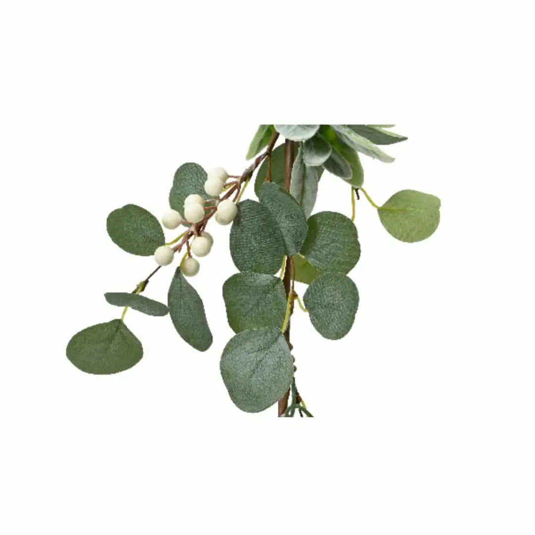 Introducing our 5ft Green Eucalyptus Polyester Decorative Garland with Berry, a must-have for your Christmas decorations! This stunning garland features a beautiful combination of lush eucalyptus leaves and delicate white berries, creating a natural and inviting look for your home.Measuring 5 feet in length, this garland showcases meticulously crafted eucalyptus leaves on flexible green stems, ensuring a realistic appearance that adds charm to any setting. Its durable construction guarantees that this decorative piece will last through many festive seasons.Use it to enhance Christmas trees, mantels, doorways, or wreaths—your decorating possibilities are endless! Let your creativity shine and bring the beauty of nature into your holiday celebrations with this exquisite garland.