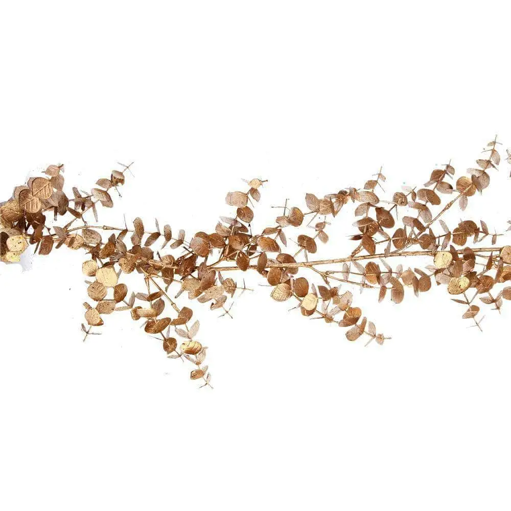 Enhance your holiday decor with the 6-foot Matt Gold Eucalyptus Garland, a stunning addition that infuses elegance and a subtle golden touch into your environment. This garland is meticulously crafted with lifelike eucalyptus leaves sporting a matte gold finish, delivering a one-of-a-kind and captivating ambiance.