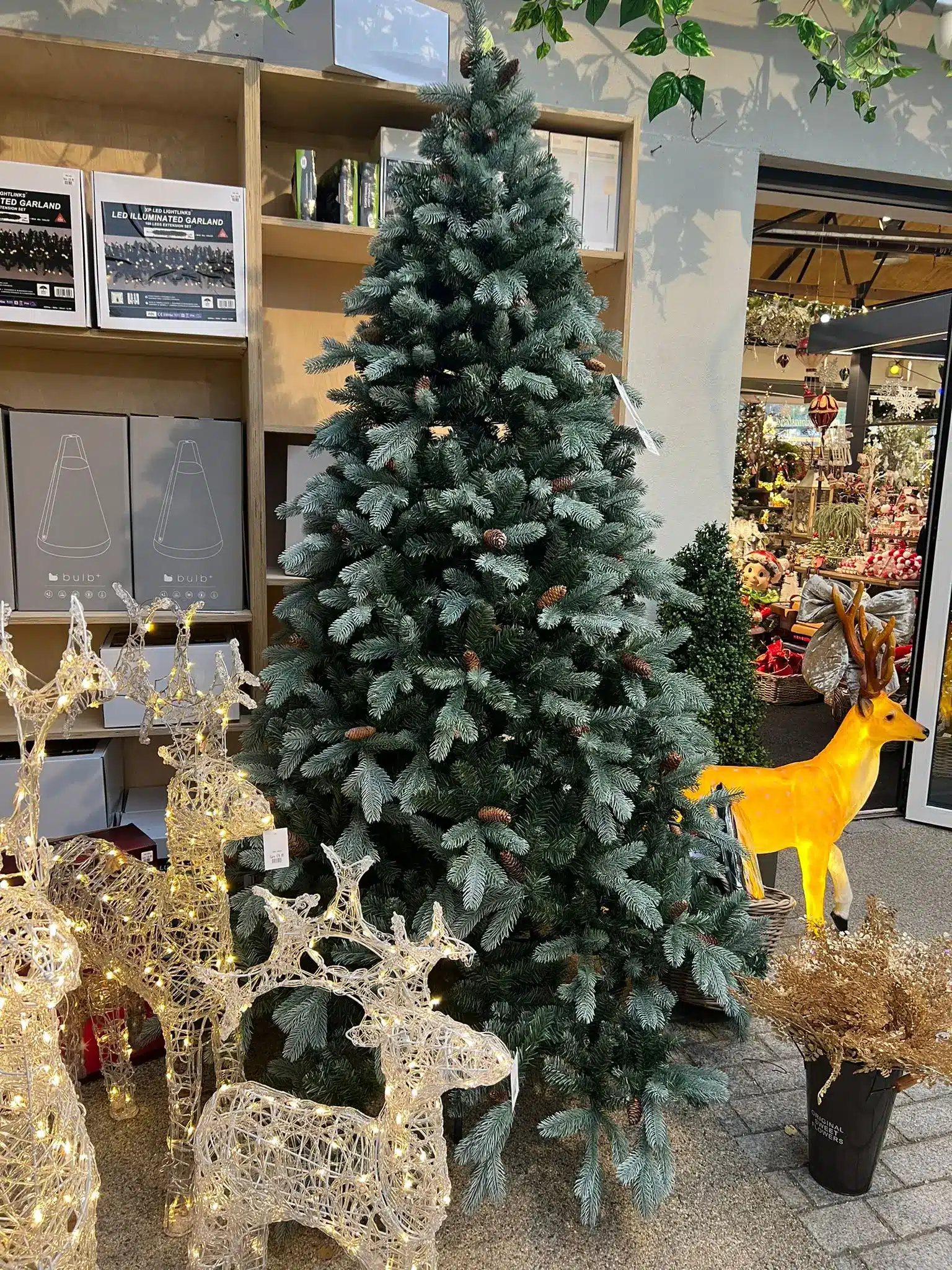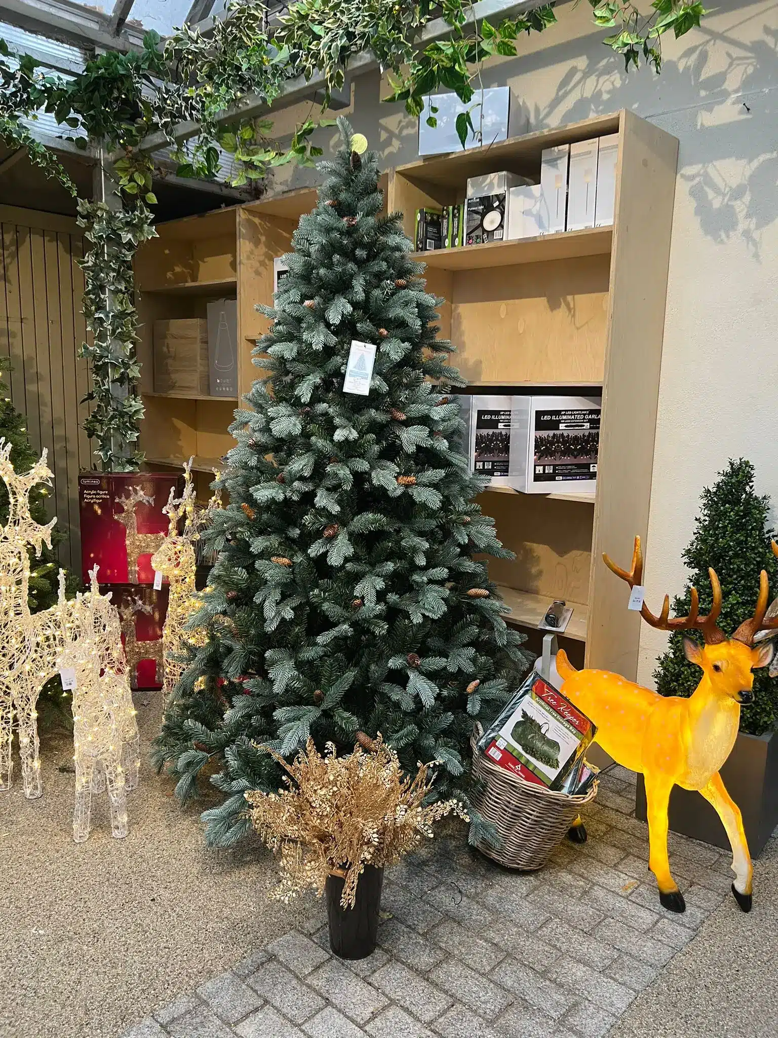 A fantastic artificial Christmas tree packed with fine details and beautiful real feel greenery. The Frosted Colorado Spruce offers a wintry touch with its frosted tips and meticulously crafted pine cones. Alongside the “Real Feel” branches. This makes for an exceptionally realistic tree. Densely packed with “Real Feel” branches and polyethylene tips for a superb frosty feel. This tree is cleverly constructed with a strong aluminium frame. This Christmas tree is easy to set up and take down with its hinged branches for easy and compact storage. A wonderfully festive artificial Christmas tree that will be at home where you place it each Christmas.