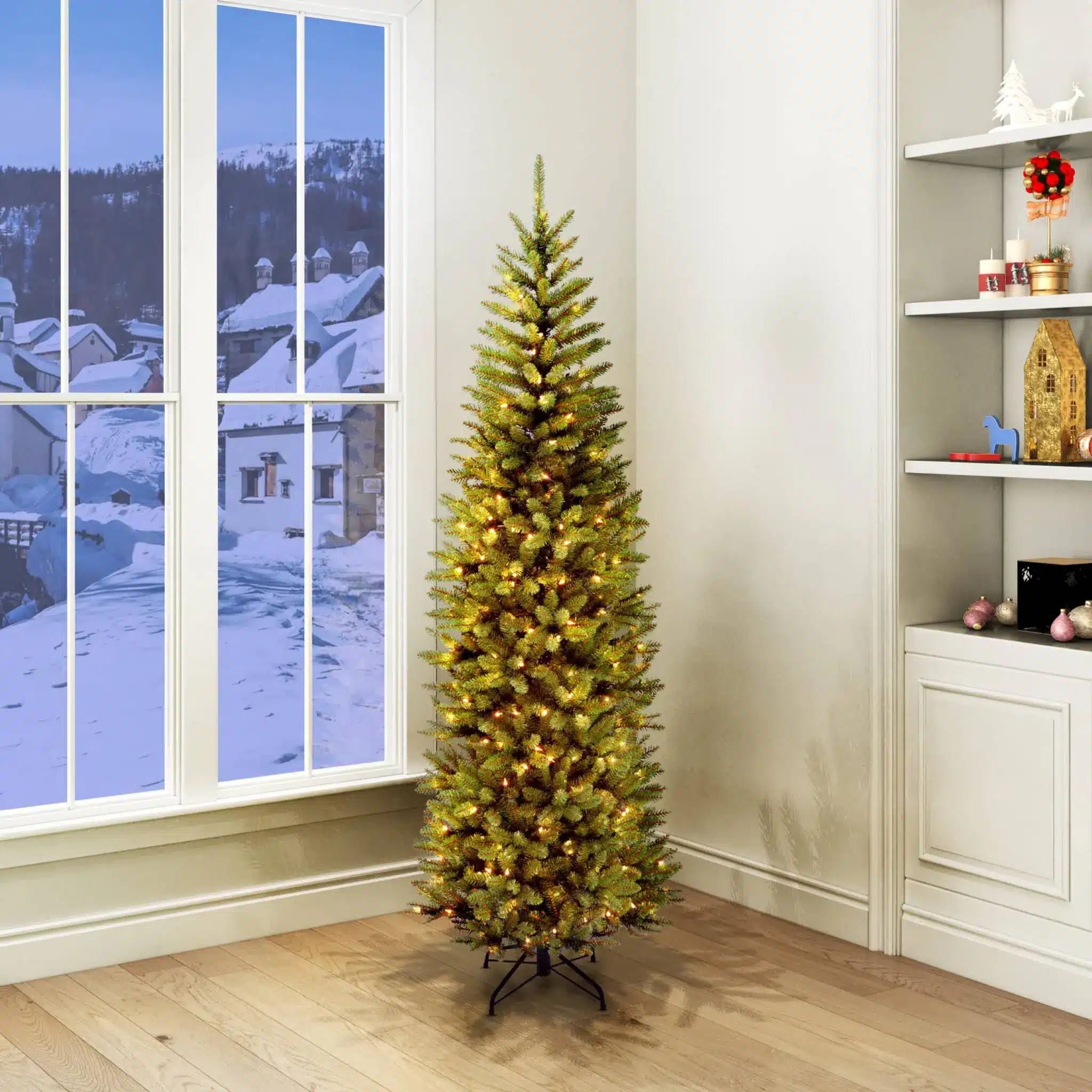 Capture the essence of the season with the 7-foot Kingswood Fir Pencil Slim Pre-Lit Christmas Tree, featuring 300 warm white LED lights. This slim and space-efficient masterpiece seamlessly blends elegance and practicality, serving as the perfect focal point for your festive decorations.