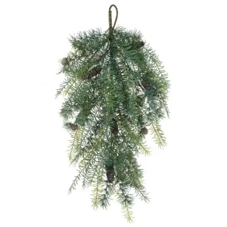 A wonderfully realistic-looking artificial plant. This Cedar Asparagus Teardrop is packed full of beautiful detail. With realistic plant leaves and branches, the realism is uncanny. Alongside this comes assorted crafted pine cones within the teardrop. With a rope hook to hang this up on the wall or doors with a door hook. This is an exceptional plant that will look wonderful in your Christmas decorations.