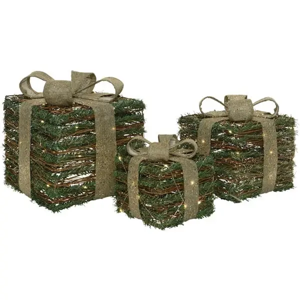 A stunning set of three LED Christmas Boxes. These rattan style gift boxes are crafted with attention to detail. Each box contains LED lights for a beautiful warm glow and a six-hour timer to help you automatically set on times. Each parcel has its own battery pack which hides neatly under the box. The set looks stunning in the day but even better in the night. A perfect festive set for mantlepieces, tables or to put next to the Christmas tree. This LED Rattan Gift Box Set will be a perfect Christmas display decoration for years to come. For indoor use only.