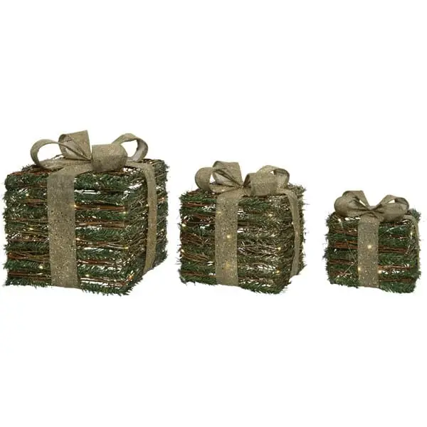 - Set of 3 LED green glittery gift boxes with natural ribbon