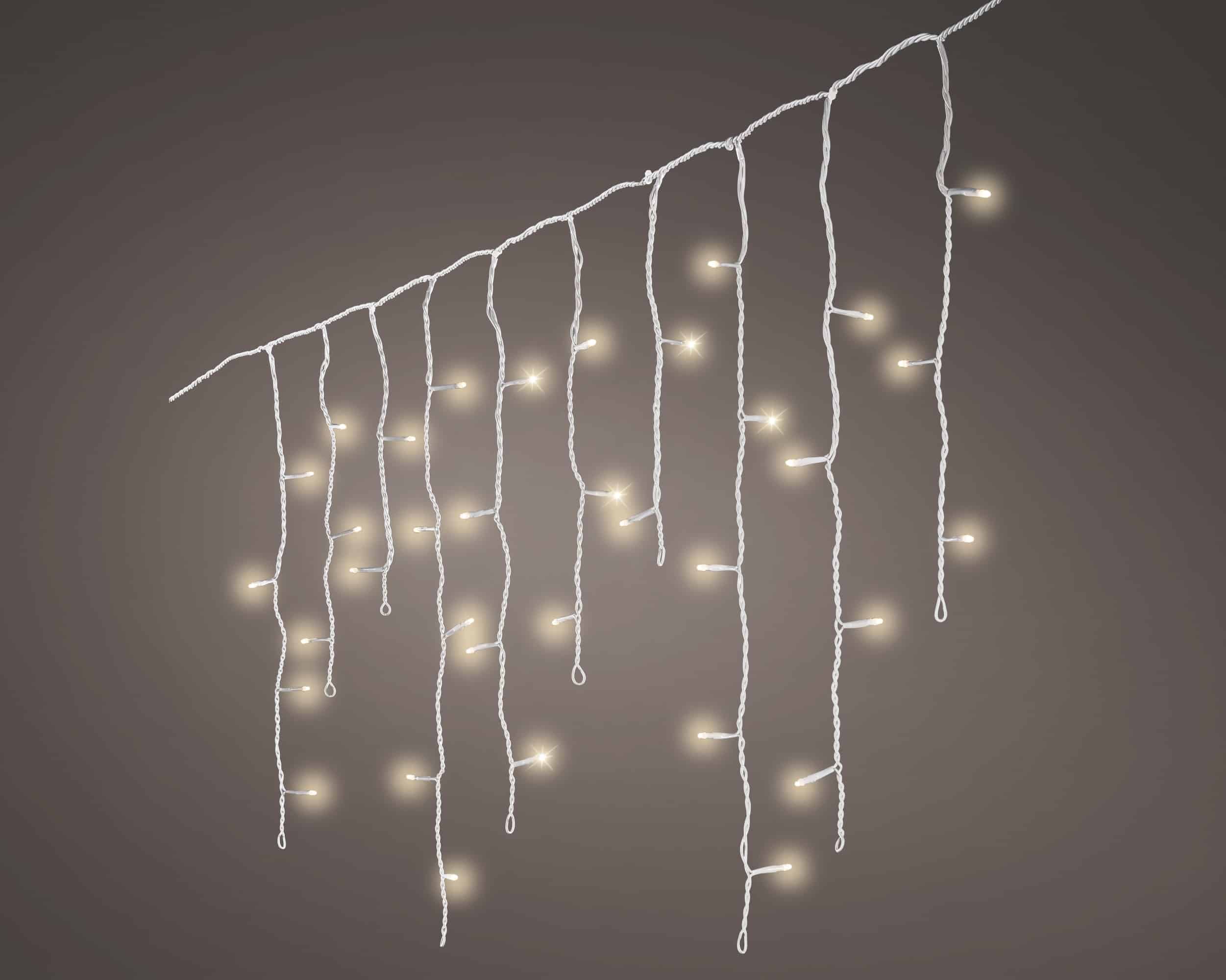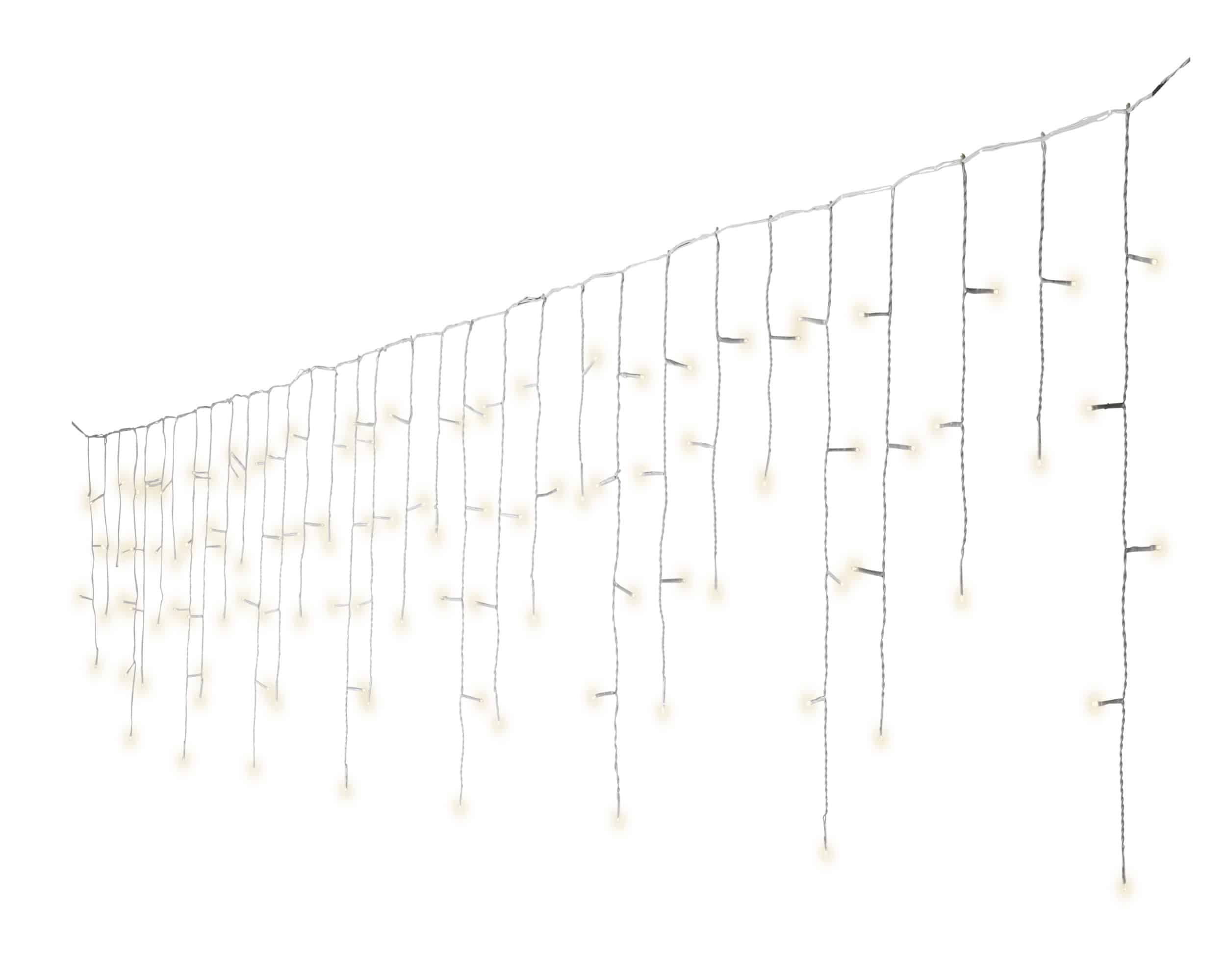 Dress up the front of your house this year with our fantastic micro LED Warm White Icicle Twinkle Christmas Lights. Simply position the string along the eves of your roof and allow the strings to drop. Each string varies in length. The cable is white so that it is less conspicuous at night. There is an 8-meter cable leading from the power source to the first string of lights.