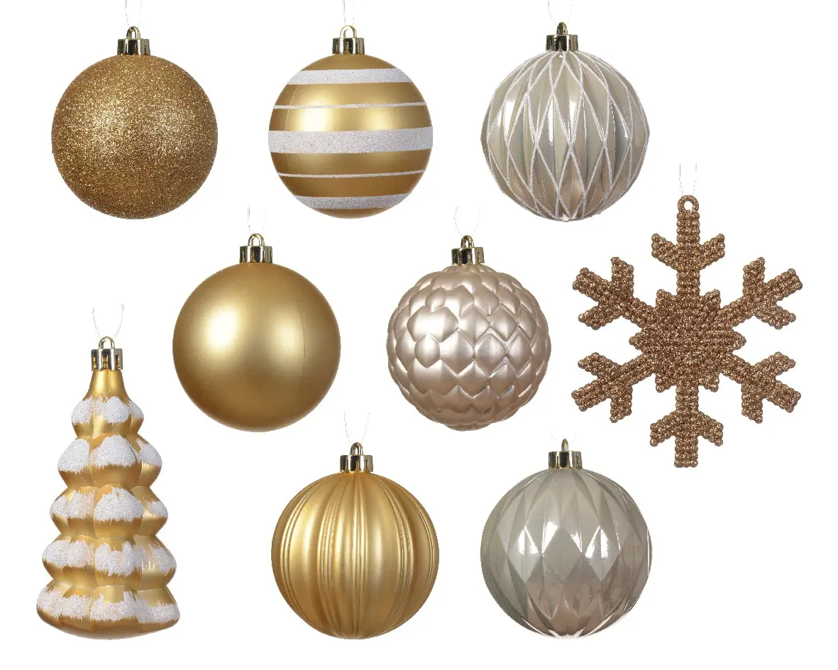 A brilliant way to start decorating your Christmas tree. This Mixed Christmas Bauble Box gives a variety of different baubles and other Christmas decorations for a gold, white, theme like Santas, snowflakes, Christmas trees, and cars. Featuring exceptional quality material and shatterproof construction. Shatterproof Christmas tree ornaments are ideal for families with children and pets. They are packaged in a box that is lightweight and durable, so you can easily store and keep the ornaments safe for years to come. These Xmas decorations are a brilliant way to start decorating your Christmas Tree.