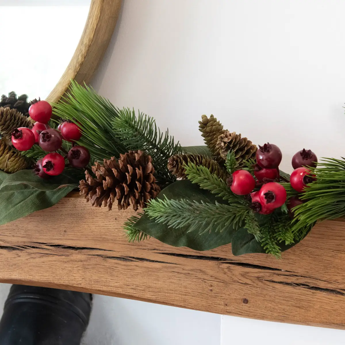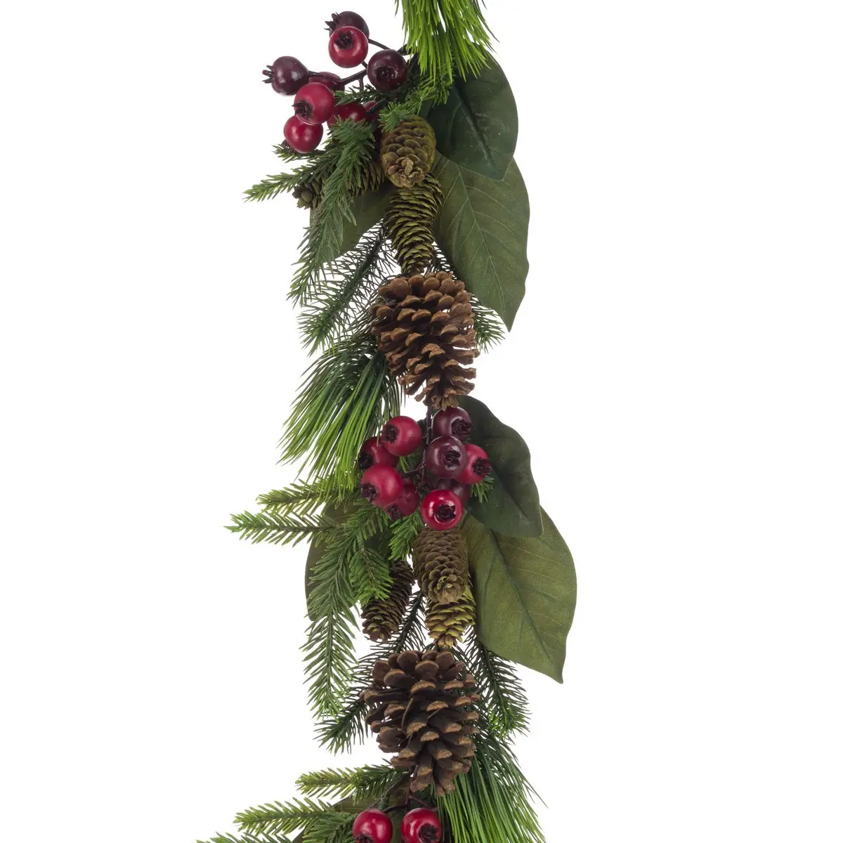 A beautifully crafted Christmas Garland, the Ryhall Berry Garland features a selection of dark red, realistic berries, along with meticulously crafted pine cones and a variety of lifelike tree leaves.