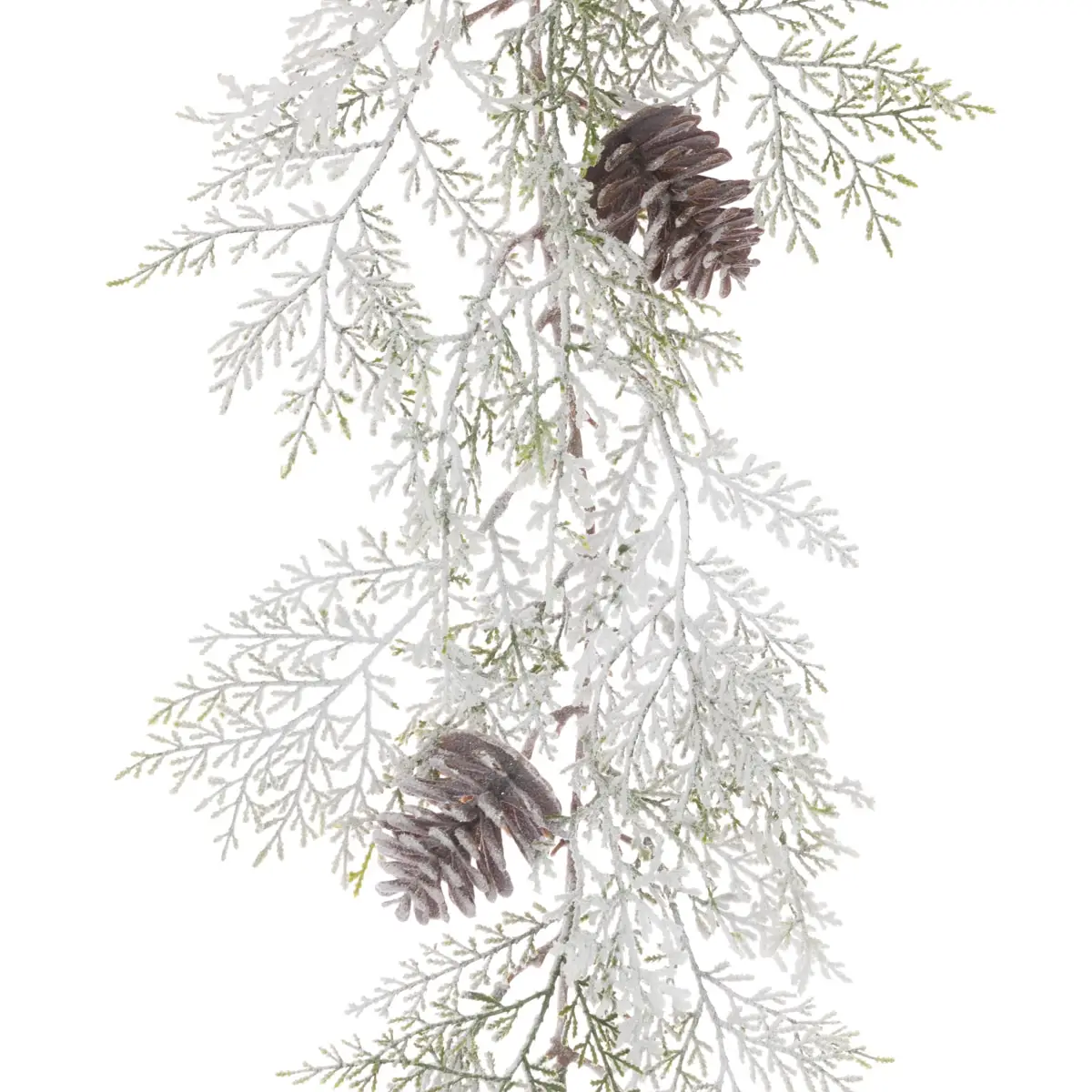 Here again for another festive season, The 6ft Snowy Pine Garland is a delightful addition to your Christmas decor. This generous but delicately crafted garland is decorated wish pine cones. This simple xmas garland can be used as a primary decorative piece or as part of a broader arrangement. At 6 feet in length, This garland is perfectly suited to table decoration or gracefully drapes along mantels, banisters, or doorways, leading the way to your own festive wonderland.