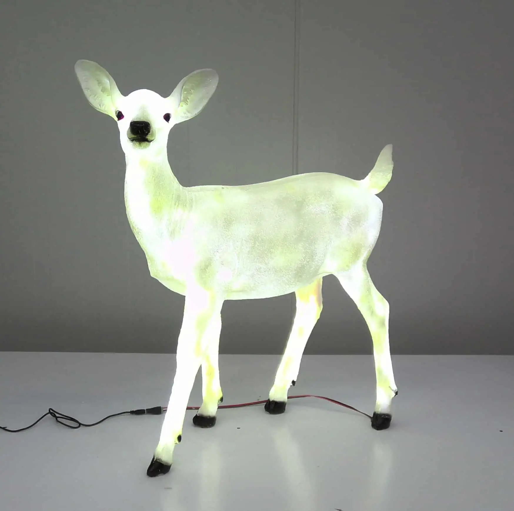 A beautiful sight in your garden, this stunning Standing Fawn Deer With Cool White LED Lights is brimming with detail. The internal LED lights provide a unique glow. Made from an exceptional resin material and with an AC adapter, this Deer is sure to be a hit among your Christmas Decorations. This decorative deer is suitable for outdoor use though a dry box is recommended for the adapter.