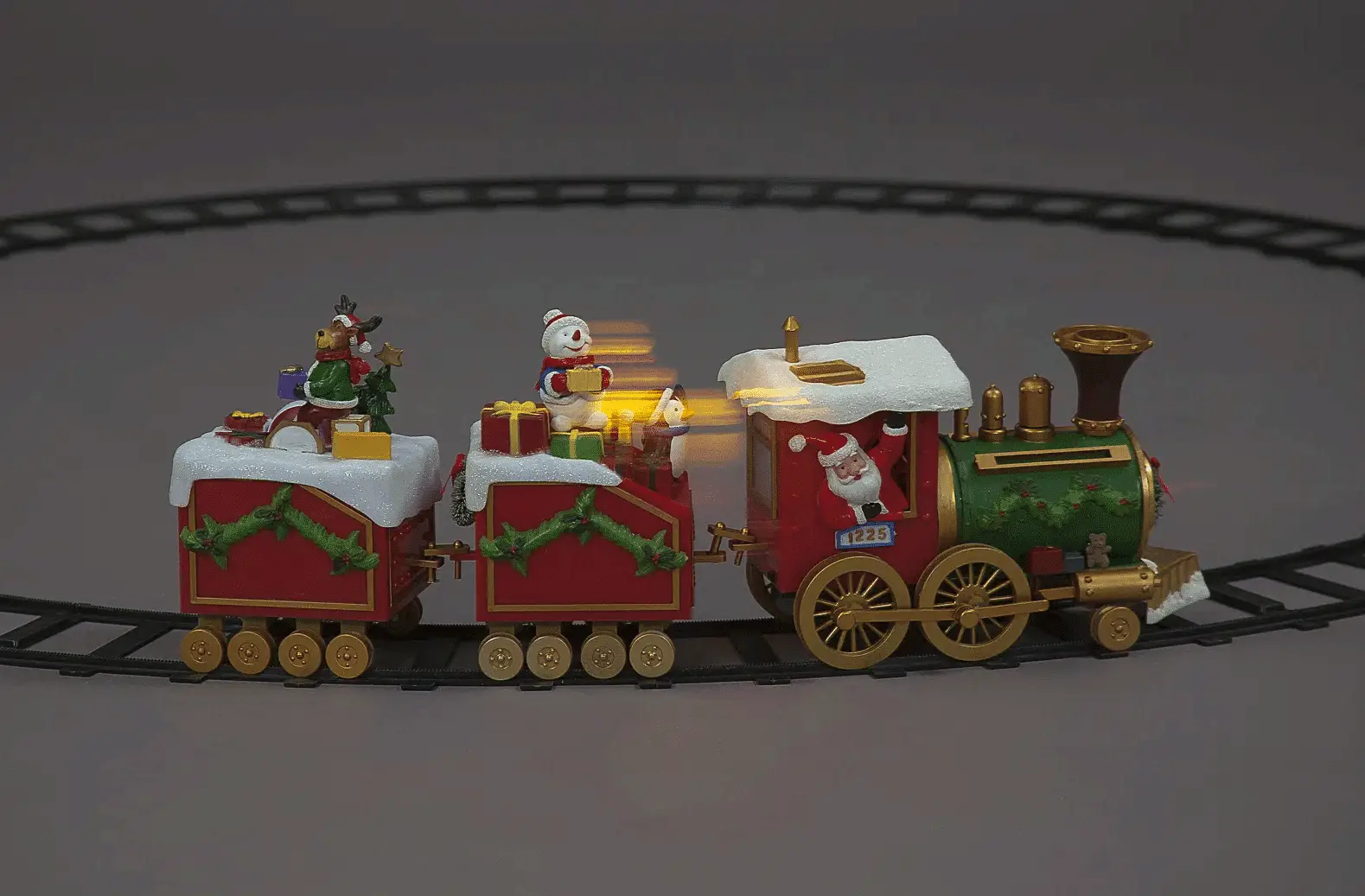 Experience the magic of a battery-operated Christmas Train ornament, adorned with captivating LEDs. Featuring a track diameter of 136cm, it elegantly fits beneath a tree decoration. The 50cm train glides gracefully and is powered by 4 x AA batteries (batteries not included). Designed exclusively for indoor use, this product is a decorative piece and not intended as a toy.